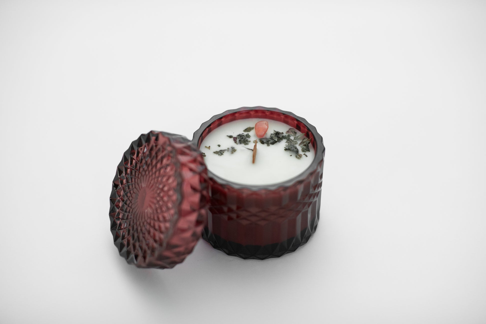 Hand-poured soy wax candle with essential oils and a cedar wooden wick, elegantly housed in a glass vase and scented with light cherry and honey vanilla for a truly heavenly experience. -
